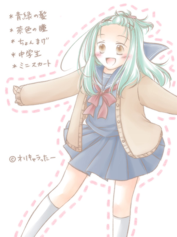 そうそう。ついったといえば「●●ったー」というお遊び診断が流行ってる(?)のですが、そこに「オリキャラったー」というのがあって、それで「あなたのオリキャラは『青緑色の髪と茶色の瞳を持つ中学生で、髪型はちょんまげ。ミニスカートを着用しています。」って出たので即興で落書きしたオリキャラ。